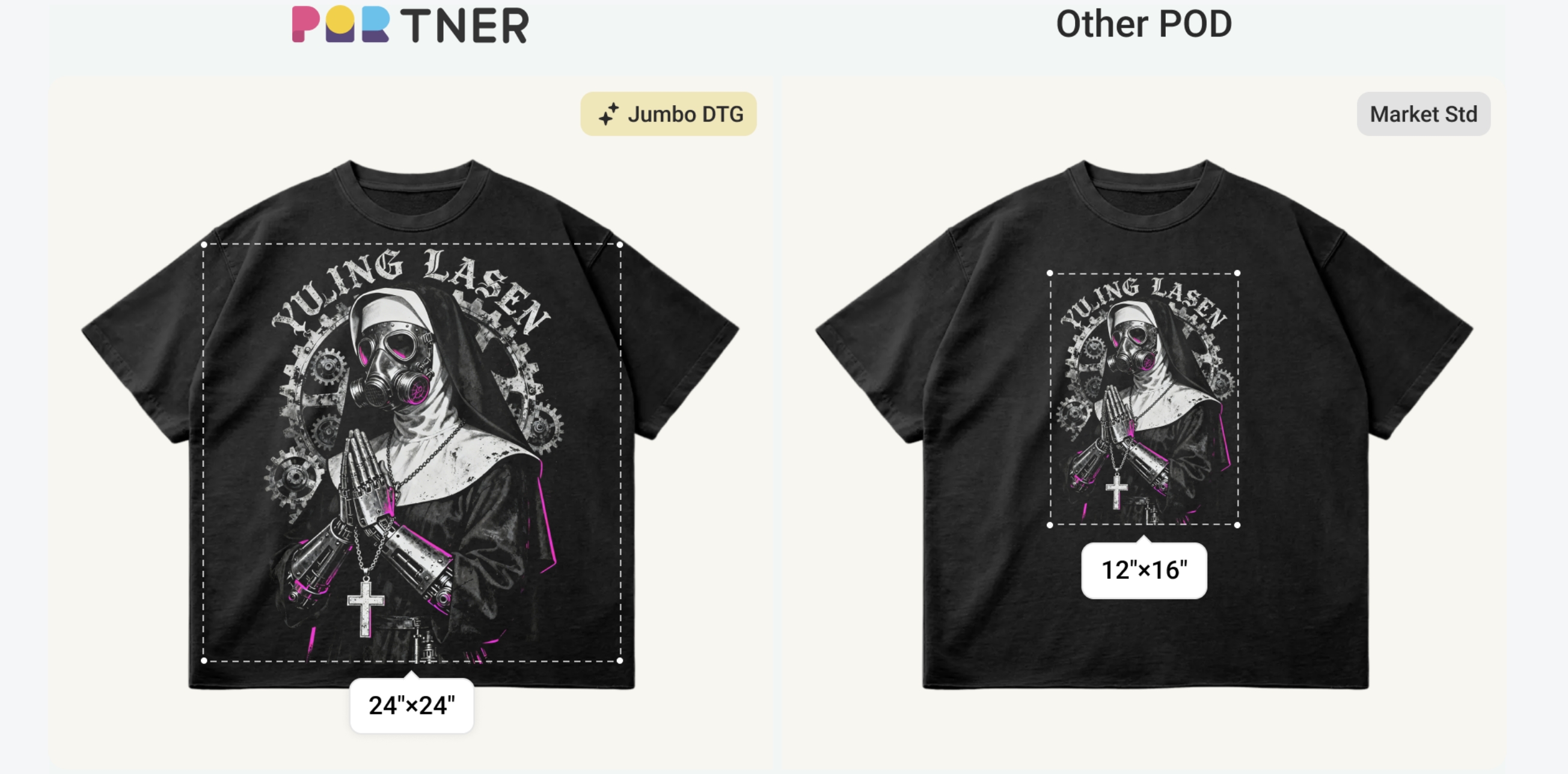 "Our mission has always been to help small and medium-sized clothing sellers build their own apparel brands. Therefore, we provide creators with tools to compete with major retail brands. We saw a gap in the market and a frustration among designers who had incredible, large-scale artwork that simply couldn't be realized through standard POD," said a spokesperson from PODpartner. "With our new 24x24 inch capability, we're not just offering a bigger print; we're offering brands a way to create true 'statement pieces.' This is about maximizing visual real estate to create higher perceived value, stronger brand recognition, and ultimately, better profitability for our partners."